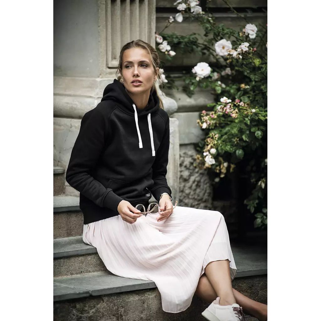 Trendikäs ja ylellinen huppari mukavasta luomupuuvillasekoitteesta. Kudotut kiristysnauhat ja elegantit yksityiskohdat kuten vuorattu huppu viimeistelevät hupparin ulkonäön. Sisäpuolen materiaali on harjattu ylellisen pehmeän tuntuiseksi.